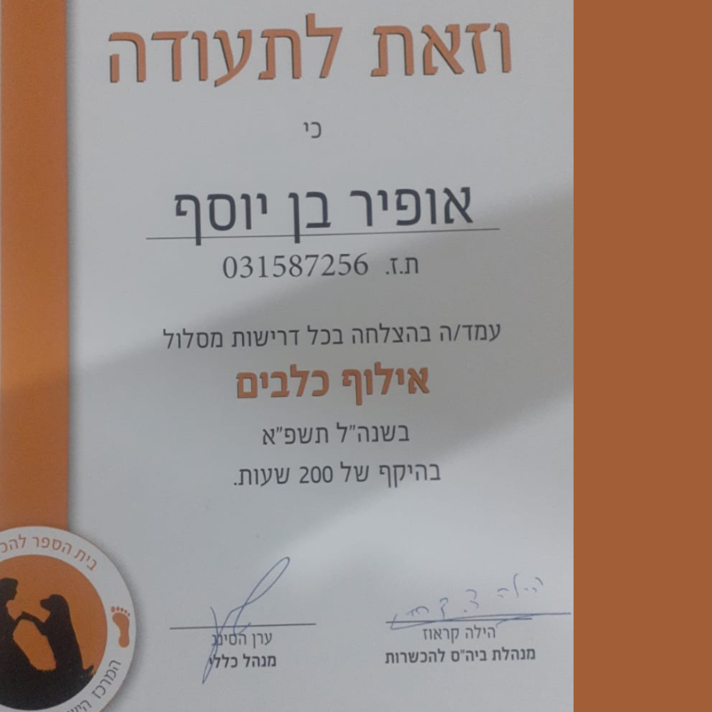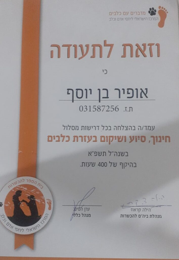 שמי אופיר, למדתי כלבנות טיפולית ואני רואה בכך שליחות לסייע לכל ילד להתמודד עם הפחדים והקשיים שמלווים אותו, ולהעצים אותו. כל ילד כזה מעלה חיוך על שפתי ומעניק לי סיפוק אישי בסוף כל יום.